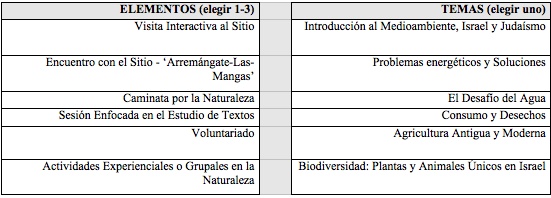 El itinerario de Israel Eco-Day se compone de varios elementos, en el contexto de un tema enfocado ecológicamente. Usted, el cliente, elige el tema 1-3 elementos (dependiendo de la duración del programa y la ubicación de su grupo en Israel) que le gustaría incorporar al horario del Israel Eco-Day de su grupo. Cada programa tiene currículo personalizado, que incluye estudio tanto de fuentes judías como generales, abarcadas en el transcurso del día. La siguiente es una lista de temas y elementos a eligir:
